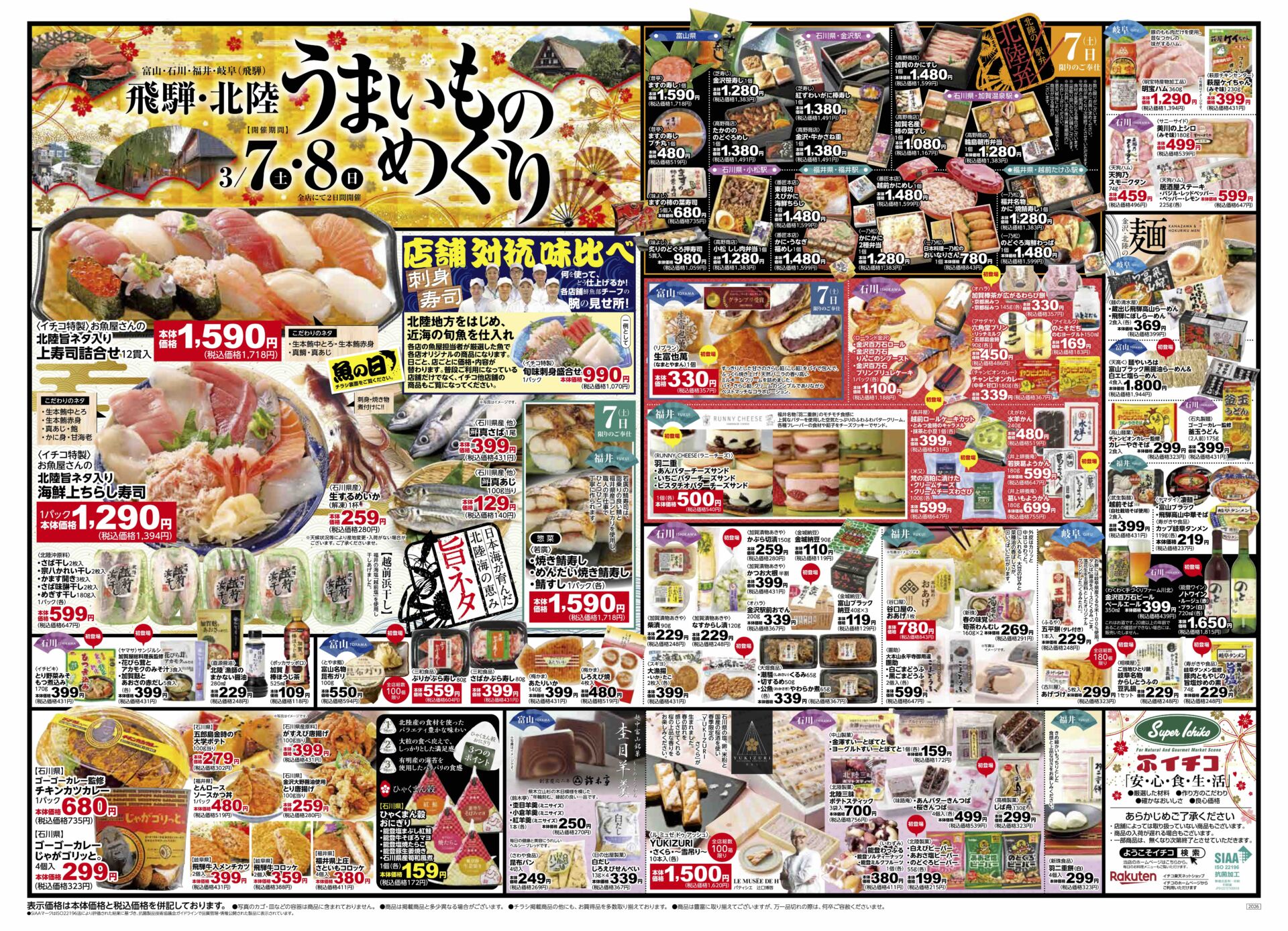 平素は格別のご高配を賜り厚く御礼申し上げます。さて、この度、弊社商流のお得意様・スーパーイチコ様にて慣例の飛騨・北陸うまいものめぐりの催事をバックアップさせて頂く事になりました。今回は、富山名物昆布ガリをはじめ様々な商品を数量限定にてご用意させて頂きました。3月7日(土)8日(日)は是非お近くイチコ各店へお出かけ下さい。